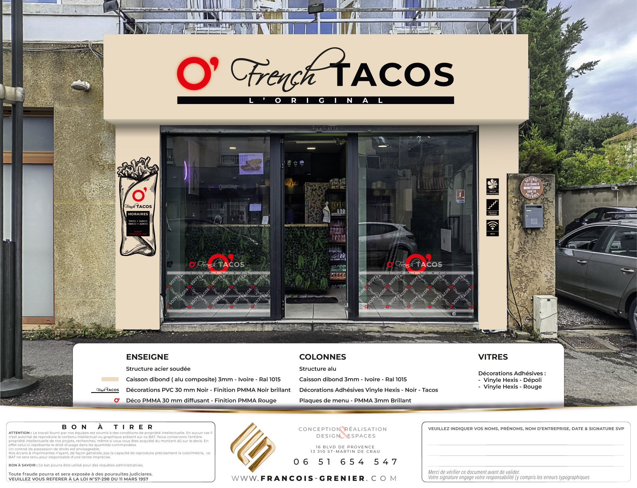 Un projet pensé pour valoriser la marque O’Tacos, renforcer son impact visuel et inscrire le restaurant dans une image contemporaine et professionnelle.